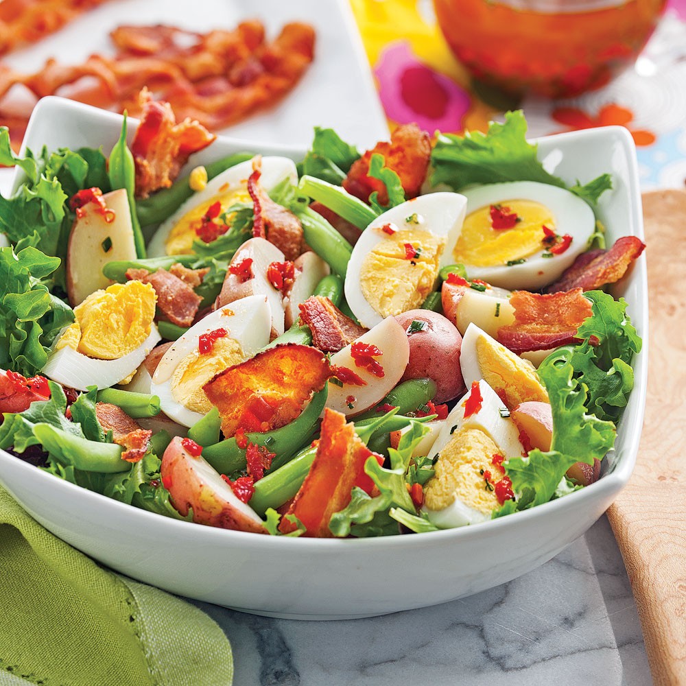 ASTUCES - POUR UNE VERSION PLUS RICHE : ON PEUT AJOUTER DES ŒUFS DURS, DU THON, ET DES LARDONS GRILLÉS.